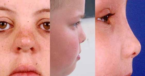 , thick and highly arched eyebrows, abnormalities of the outer ear, a short nose