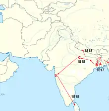 The spread of the first cholera pandemic was closely linked to warfare and trade.[4] According to economic history professor Donato Gómez-Diaz, "[advances] in commercial exchange and navigation contributed to cholera’s dispersion."[5] Navy and merchant ships carried people with the disease to the shores of the Indian Ocean, from Africa to Indonesia, and north to China and Japan.[9] During the Ottoman-Persian War of 1821–1823, cholera would affect both armies in what is modern-day Armenia.[4] Hindu pilgrims spread cholera within the subcontinent, as had happened many times previously, and British troops carried it overland to Nepal and Afghanistan. In 1821, British troops spread cholera to Oman after becoming infected with it in India.[4]