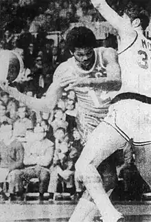 Western Conference guard Warren Jabali drives to the hoop as Eastern Conference forward Doug Moe guards him closely during the 1970 ABA All-Star Game on January 24, 1970 at the Indiana State Fair Coliseum in Indianapolis, Indiana.
