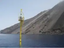 The Sciara del Fuoco stability is monitored by an elastic beacon. Marine surveys occurred offshore of Sciara del Fuoco for monitoring the Stromboli submarine slope after the two tsunamis in December 2002. All the morphological changes and depositional processes have been studied carefully. Thanks to thirteen surveys in 4 years, it has been possible to reconstruct the morpho-sedimentary evolution of the submarine slope. The scar has been progressively filled with lava; at the beginning, the filling rate was high because of the entrance of lava flows into the sea and to the morphological readjustment of the slope; later on, the rate dramatically decreased when the eruption stopped. In February 2007, the scar was already filled by 40%, but then a new type of eruption occurred. The wideband seismic monitoring system of the Stromboli volcano has been active since January 2003 and was designed to detect and analyze the seismicity related to the eruptive processes taking place on the island.[26] The network consists of 13 digital stations with broadband sensors. The data are acquired from GAIA (INGV – CNT) digital recorders with 24-bit analog-to-digital converter and a sampling frequency set at 50 samples per second for each channel. The timing system of these stations is based on the synchronization of the internal clock with the absolute time signal of the Global Positioning System (GPS) which has an accuracy of 5 seconds.[27] Signals are transmitted continuously via radio modem to two different data logging centers. The first is located on the island of Stromboli, at the INGV Observatory of San Vincenzo, and receives signals from the stations on the north side, which there is direct visibility with. The second is located in Lipari, at the INGV Observatory, and receives signals from the stations on the southern side. From Lipari, the signals are sent again to Stromboli, at the San Vincenzo Observatory, via TCP/IP connection.[28] The signals of the entire network are then retransmitted to the INGV section of Catania and the Vesuvian Observatory (INGV) of Naples where they are monitored 24 hours a day by the surveillance staff.[29]