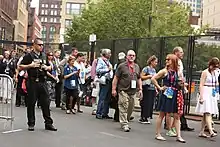 The Cleveland Police Department received $50 million in federal grants to support local police operations during the event.[30] With this grant money, the City of Cleveland sought to purchase over 2,000 riot control personnel gear sets prior to the convention for $20 million, and the remaining $30 million was planned to be used for personnel expenses.[31] Items such as water guns, swords, tennis balls and coolers have been banned by the City of Cleveland from the 1.7-square-mile "event zone" outside the convention hall by the City of Cleveland, but because of a statewide open-carry law permitting the open carrying of guns, firearms are permitted.[26][32][33][34] The Cleveland chapter of the NAACP raised concerns in March 2016 in a letter to city and county leaders about security at the convention, writing that police were unprepared for a "possible mix of protesters and demonstrators brandishing guns."[25][35] The Cleveland Police Union also raised concerns similar to those raised by the local NAACP in March, writing that equipment and training for police was behind schedule.[25] On July 16—the eve of the convention—the Cleveland Police Union asked Governor John Kasich to temporarily suspend Ohio's state open-carry gun law so as to block the carrying of guns within the event zone,[26] but Kasich rejected the request, writing: "Ohio governors do not have the power to arbitrarily suspend federal and state constitutional rights or state laws as suggested."[26]