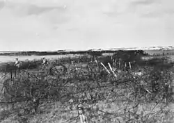 The battalion's first major battle came at Pozières in August, initially carrying ammunition for the troops of the 2nd Division when they attacked, before later undertaking defensive duties to hold the gains that were made.[5] After a period of rotating through the line throughout the winter of 191617, the 46th was committed to the First Battle of Bullecourt in early 1917. It was at Bullecourt, on 11 April 1917, that the battalion suffered its worst losses of the war.[7] As part of the pursuit of the Germans once they had withdrawn to the Hindenburg Line, the attack was initially successful as the 46th managed to break through to its objective, but it was eventually pushed back as a result of its heavy casualties.[5] The remainder of 1917 was spent in Belgium, where the 46th fought two more major actions at Messines and Passchendaele.[5] In early 1918, it was transferred south to France where it played a defensive role during the German spring offensive, seeing action around Dernancourt in April. Later in the year, it took part in the final Allied offensive that began around Amiens in August 1918.[5] Its final attack of the war was made in mid-September 1918 against the outposts of the Hindenburg Line, after which the battalion was withdrawn from the front for reorganisation and training; it was joined by the rest of the Australian Corps in early October.[8] They remained out of the line until the armistice came into effect on 11 November 1918. Following the end of hostilities, the battalion was disbanded in April 1919.[5]