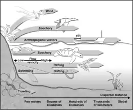 Dispersal is a vital component of an organism's life-history,[167] and the potential for dispersal determines the distribution, abundance, and thus, the community dynamics of species at different sites.[168][169][170] A new habitat must first be reached before filters such as organismal abilities and adaptations, the quality of a habitat, and the established biological community determine the colonization efficiency of a species.[171] While larger animals can cover distances on their own and actively seek suitable habitats, small (<2 mm) organisms are often passively dispersed,[171] resulting in their more ubiquitous occurrence.[172] While active dispersal accounts for rather predictable distribution patterns, passive dispersal leads to a more randomized immigration of organisms.[168] Mechanisms for passive dispersal are the transport on (epizoochory) or in (endozoochory) larger animals (e.g., flying insects, birds, or mammals) and the erosion by wind.[171][84]