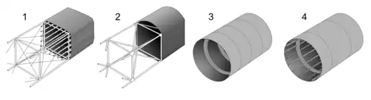 Four types of airframe construction: (1) Truss with canvas, (2) Truss with corrugate plate, (3) Monocoque construction, (4) Semi-monocoque construction.