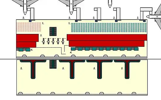 Hybrid layouts also exist. San Francisco International Airport and Melbourne Airport use a hybrid pier-semicircular layout and a pier layout for the rest.