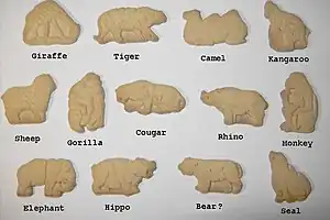 An animal cracker is a particular type of cracker, baked in the shape of an animal, usually an animal either at a zoo or a circus, such as a lion, a tiger, a bear, or an elephant. The most common variety is light-colored and slightly sweet, but darker chocolate-flavored and colorful frosted varieties are also sold. Although animal crackers tend to be sweet in flavor like cookies, they are made with a layered dough like crackers and are marketed as crackers and not cookies.[1]