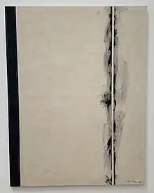 Throughout the 1940s he worked in a surrealist vein, then developed his signature style.[7] This is characterized by areas of color separated by thin vertical lines, or "zips" as Newman called them. In the first works featuring zips, the color fields are variegated, but later the colors are pure and flat. Newman thought that he reached his fully distinct, signature style with the Onement series (from 1948). The zips define the spatial structure of the painting and simultaneously divide and unite the composition. According to art historian April Kingsley, the zip in Newman's paintings are 'flashing light of a nuclear explosion and the old testament pillar of fire', thus mixing the paradox of romantic sublime with the depiction of destruction and transcendence.[8] Already 1944 Barnett Newman tried to explain America's newest art movement and included a list of "the men in the new movement." Ex-surrealists, like Matta, are mentioned, and Wolfgang Paalen is mentioned twice with Gottlieb, Rothko, Pollock, Hofmann, Baziotes, Gorky and others. Motherwell is mentioned with a question mark.[9] The zip remained a constant feature of Newman's work throughout his life. In some paintings of the 1950s, such as The Wild, which is eight feet tall by one and a half inches wide (2.43 meters by 4.1 centimeters), the zip is all there is to the work. Newman also made a few sculptures which are essentially three-dimensional zips.[10]:511