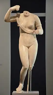 In Sparta, Pausanias described two temples dedicated to Aphrodite Areia and archeological evidence supports this claim.[1] Various authors make reference to Sparta worshipping an armoured Aphrodite, such as Plutarch, Nonnos, and Quintilian.[3] Pausanias' claim that "Aphrodite Areia" was simply a female version of Ares has some support in the contemporary epigraphy.[8][1]