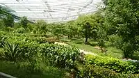 The zoo is located within the Vandalur Reserve Forest area.[24] The zoo's ecosystem consists of dry deciduous and dry evergreen scrub forest vegetation of the Eastern Ghats, a degraded forest consisting of mostly thorny bushes, receiving an average annual rainfall of 1,400 millimetres (55 in) and an average annual temperature of 26 °C (79 °F).[25] The terrain is a gentle undulating one[21] ranging in altitude from 10 to 100 metres (33 to 328 ft) with an average elevation of 50 metres (160 ft) above sea level.[25] The park was designed to keep the natural vegetation of the area intact except where enclosures, roads, and structures had to be constructed. Originally a sparse scrub forest invaded by weeds, consisting of species such as Carissa sp., Gmelina sp., Eugenia sp., Acacia sp., Instia sp. and a few other dry evergreen forest species, the park's vegetation was gradually enriched by planting dry evergreen species.[25] The entire campus has been fortified by means of a compound wall,[26] preventing any biotic interference in the park and allowing the natural growth of vegetation, which give the park the look of a natural forest. The park is built based on the 'open zoo' concept. The exhibits were originally based on taxonomic and geographical distribution of the species, but have now been replaced by ecological niches and habitats. The order of priority is local species, followed by regional, national, and international species. The use of moats has made it possible to house predator and prey in extended enclosures that provide a panorama of wildlife. There are over 75 moated enclosures in the park. Enrichments in the form of ladders, climbing materials, etc. are provided for the animals to move around the enclosure freely.[27]