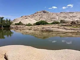 Bektauata is a small rocky range of moderate altitude located at the southern end of the Kazakh Upland system (Saryarka). The dry alluvial plain at the mouth of the Tokrau river lies to the east of the range. The nearest airport is Balkhash Airport.[2] There are rock formations, caves and rock pools in different spots of the Bektauata area. The largest cave is 48 meters (157 ft) in length. The inner part of the cave is full of water to a depth of 1.5 meters (4 ft 11 in).[1]