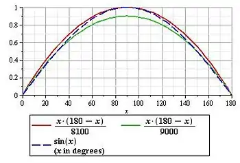 The part of the graph of sin x in the range from 0° to 180° "looks like" part of a parabola through the points (0, 0) and (180, 0). The general such parabola is