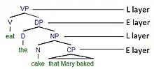 Due to these limitations in each system, where both lexical and expressive categories can only be one layer deep, the recursive and unbounded hierarchical structure of human language is surprising. The Integration hypothesis posits that it is the combination of these two types of layers that results in such a rich hierarchical structure. The alternation between L layers and E layers is what allows human language to reach an arbitrary depth of layers. For example, in the phrase "Eat the cake that Mary baked", the tree structure shows an alternation between L and E layers. This can easily be described by two phrase rules: (i) LP → L EP and (ii) EP → E LP. The recursion that is possible is plainly seen by transforming these phrase rules into bracket notation. The LP in (i) can be written as [L EP]. Then, adding an E layer to this LP to create an EP would result in [E [L EP]]. After, a more complex LP could be obtained by adding an L layer to the EP, resulting in [L [E [L EP]]]. This can continue forever and would result in the recognizable deep structures found in human language.[39]