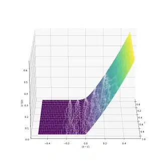 The surface plot of the value of a European call option over time and price of underlying stock, along with some representative stock price trajectories. If the stock price starts high above the strike price, then it is likely to end up above the strike price. If the stock price starts much below, then it has a small chance of ending up above the strike price. The average value of the trajectories' end-point is exactly equal to the height of the surface.