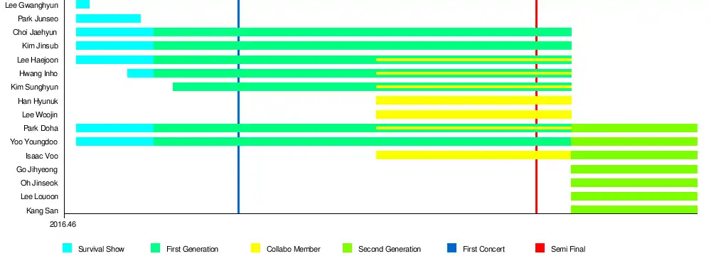 The survival show with the same name as the group was a 2016 reality boy group unit survival show that aired every Saturday 10pm on Mnet and tvN. It was a large-scale project in which the units of a selected number of members would be produced from a pool of 49 free-agents.[44]