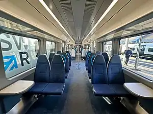 The Class 701 features regenerative braking, wide gangways between coaches, wide doors for ease and efficiency of boarding and alighting, 2+2 seating arrangement throughout, Wi-Fi, at-seat USB charging points, real-time passenger information screens, air conditioning, bicycle spaces (three for each five coaches), and accessible toilets for disabled passengers (one in each five coaches).[2][20]