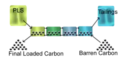 As it moves up the train, the carbon loads to higher and higher concentrations of gold, as it comes in contact with higher grade solutions. Typically concentrations as high as 4000 to 8000 grams of gold per tonne of carbon (g/t Au) can be achieved on the final loaded carbon, as it comes in contact with freshly leached ore and pregnant leach solution (PLS).