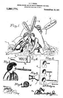 In 1916, Pidgin filed a patent application to display dialogue in silent films, proposing that actors inflate balloons or party favor-like objects with text on them to recreate the act of speaking.[21] The idea never took off, and this proposal has only received modern attention as being a rather ludicrous idea.[22][23][24]