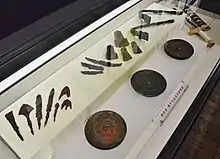 The first chamber was 13.6 by 10.1 meters and contained a long clay-covered wooden casket orientated to the each. Inside, the casket was painted red and was divided in several sections by partitions. The main (central) partition contained the burial, with side-rooms to the east and west, which were further sub-divided. Figurative haniwa, one of which depicted a house, were also found within the casket. Grave goods included three bronze mirrors, (one of which appears to be Late Han dynasty), two sets of armor, and 10 iron swords, hatchets and other bladed weapons and 370 iron arrowheads, remnants of leather shields with rhombus or sawtooth decorations, magatama and glass beads. The second burial chamber was smaller, at 7.5 by 3.7 meters, and the wooden casket had no clay covering. As with the first burial chamber, the casket was divided into compartments; however, the number of grave goods was smaller and different in nature. One bronze mirror was placed on the chest of the deceased, who also a necklace with magatama and other beads, and two iron swords were found, one on either side of the body. The eastern sub-chamber had more than 50 iron agricultural implements, but these were too small to have been of practical use and appear to have been made as ritual objects. The western sub-chamber had on 14 iron arrowheads.[2] The artifacts were collectively designated a National Important Cultural Property in 2013.[3]