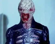 Like his fellow Cenobites, Chatterer's body has been subjected to an extreme form of body modification and ritual scarification; in Chatterer's case, his face has been severely disfigured and his lips have been peeled back to permanently expose his teeth, which he can only click together as a means of communication. He is a member of the entourage of lead Cenobite Pinhead, accompanying him whenever he is summoned via the box and acting as the group's enforcer, physically attacking and restraining potential victims, often by shoving his hand in their mouths.[4][5]