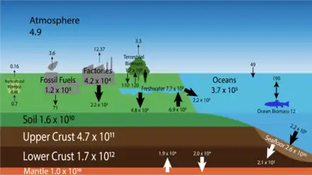 Chromium cycles through the Earth atmosphere, soil, freshwater bodies, rivers, oceans, crust and mantle. The arrows indicate fluxes given in gigagrams (1,000 metric tons) of chromium per year. The corresponding stocks (inventories) indicate reservoirs of chromium given in gigagrams of chromium.
