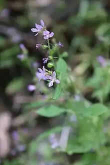 Clarkia heterandra is a species of flowering plant in the family Onagraceae known by the common name mountain clarkia. It is endemic to California, where it is from the forests and woodlands of several of eastern and western mountain ranges. It is an annual herb producing an erect, glandular stem to around half a meter in maximum height. The lance-shaped to oval leaves are up to 8 centimeters long and are borne on petioles of up to 2 centimeters. The top of the stem is occupied by the inflorescence, with open flowers and closed buds. The sepals remain fused as the flower blooms from one side. The pink petals are oval in shape and just a few millimeters long. There are 8 stamens, some large and some small and sterile. The fruit is a small, hard body 2 or 3 millimeters long containing 1 or 2 seeds.