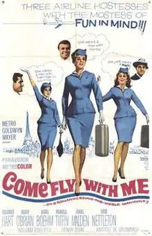 Come Fly with Me is a 1963 British comedy film about three beautiful international air hostesses looking for romance and excitement. The film has dramatic or soap opera elements to it, and was a vehicle for glamorizing the Jet Age and the prestige, adventure and romance that came with being an air hostess. It is based on Bernard Glemser's 1960 chick-lit novel Girl on a Wing,[1] which was published again in 1969 under the title The Fly Girls.