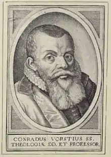 Conrad Vorstius (German: Konrad von der Vorst; Latin: Conradus Vorstius; 19 July 1569 – 29 September 1622) was a German-Dutch heterodox Remonstrant theologian, and successor to Jacobus Arminius in the theology chair at Leiden University.[1][2] His appointment, and the controversy surrounding it, became an international matter in the political and religious affairs of the United Provinces during the Twelve Years' Truce, supplying a pretext for the irregular intervention of King James I of England in those affairs.[3][4] Vorstius published theological views which were taken to show sympathy with the Socinians, and was declared a heretic at the Synod of Dort in 1619.[5][6][7]