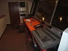 The control booth, control room, lighting box, technical booth, tech booth, or just booth used by television, film or theatrical technicians is the area designated for the operation of technical equipment (lighting and sound), lighting controls and sound board. Often one or two followspots may be located in the booth as well. In a theater, it is generally an enclosed space with a large sliding window with a good view of the stage centered in the back of the house. It may be on the ground floor or at the balcony level. In a film or television production, it might be in a trailer or other space near the studio.[1][2]