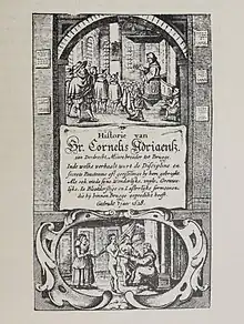 He was born at Dort (Dordrecht) in 1521, and died at Ypres on 14 July 1581.[3] He wrote sermons full of invectives against the leaders of the Huguenots in the Low Countries.[3] There are many editions of these sermons, the first of which was published in 1569.[3] Another at Amsterdam, in 1607 and 1640, bears a figure joined to the title which gives an idea of the character of the book.[3] It represents the strange discipline to which Adriaensen submitted his penitents, in order to deliver them from the natural timidity which hindered them from boldly confessing to him all their thoughts, their words, their songs, and their actions, which (according to Christian thought) have their origin in the temptations peculiar to the flesh; discipline which Voet called "Disciplinam gymnopygicam Cornelianam", in his Disputationes Selectae 4:262.[3]