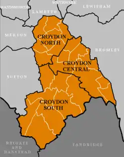 The 3 constituencies of the London Borough of Croydon, Croydon North, Croydon Central and Croydon South[22]