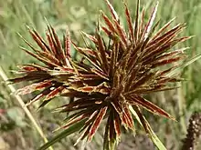 The perennial sedge typically grows to a height of 1 metre (3.3 ft) and has a tufted habit. It blooms between July and March produces brown flowers.[2] The sedge has a short rhizome connecting plants together. The culms are smooth and triangular in cross section, they are a pink-red toward the base. The leaves have a width of 4 to 8 millimetres (0.16 to 0.31 in) and are ridged with deep sharp depression down the middle. Between two and seven inflorescences can be found on each stem. The inflorescence are composed of up to 20 or smaller red-brown spikelets which are 10 to 28 mm (0.39 to 1.10 in) in length.[3] After flowering it will form a trigonous dark brown-black nut with a narrow-obovoid shape that is approximately 1.5 mm (0.059 in) with a diameter of around 0.6 mm (0.024 in).[4]