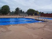The large and small gyms, locker rooms, and swimming pool, on the south side of the quad, are also original. The big gym, home to basketball, volleyball, badminton, and several families of small birds which build nests in the old lights in the ceiling, received a new paint job in 2006 courtesy of the Don's Club. The pool deck has two pools, the 12-foot diving well and the 6-lane pool, which is 3.5 feet at the ends and 4 in the middle. Water polo cannot be played at Del Mar because of the pool's depth, or lack thereof. There are seven tennis courts, four outdoor basketball courts, two sand volleyball courts that are rarely used, the weight room, a football practice field, a baseball diamond, three softball/baseball fields, and a large field that houses soccer. There is also the Bowl, housing the brand new artificial-turf athletic field and appropriately new rubber track which is used for field hockey, soccer, and football.[21]
