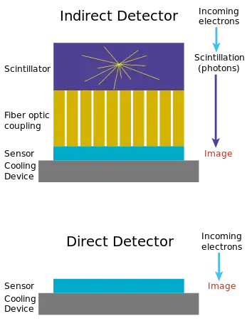 The use of scintillators to convert electrons to photons in CCD and CMOS cameras reduces the detective quantum efficiency (DQE) of these devices. Direct electron detectors, which have no scintillator and are directly exposed to the electron beam, typically offer higher DQE than scintillator-coupled cameras.[2][8] There are two main types of direct electron detectors, both of which were first introduced to electron microscopy in the 2000s.[9][10]