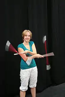 The manipulation of the devil stick (also devil-sticks, devilsticks, flower sticks, stunt sticks, gravity sticks, or juggling sticks) is a form of gyroscopic juggling or equilibristics, consisting of manipulating one stick ("baton", 'center stick') between one or two other sticks held one in each hand. The baton is lifted, struck, or stroked by the two control sticks ('handsticks', 'sidesticks', or 'handles'), stabilizing the baton through gyroscopic motion.[1]