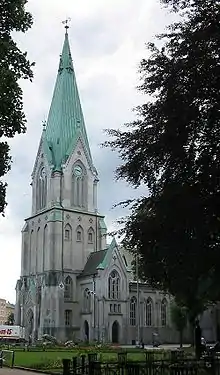 The present church is the third cathedral in the city and the fourth church in the town square in Kristiansand. The church was built after a drawing by the architect Henrik Thrap-Meyer. The church is described as neo-gothic style. The building is 70 metres (230 ft) long and 39 metres (128 ft) wide, and the tower is 70 metres (230 ft) high. The Cathedral has a beautiful wooden ceiling and six beautiful stained glass windows with Biblical themes.[2]
