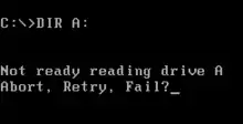 The dir command is supported by Tim Paterson's SCP 86-DOS.[15] On MS-DOS, the command is available in versions 1 and later.[16] It is also available in the open source MS-DOS emulator DOSBox. MS-DOS prompts "Abort, Retry, Fail?" after being commanded to list a directory with no diskette in the drive.