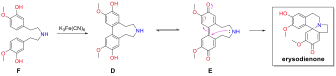 A biomimetic synthesis route for erysodienone was developed based on a similar oxidative phenol coupling mechanism. Barton and co-workers[2] found that treating bisphenolethylamine precursor F with oxidants such as K3Fe(CN)6 initiated oxidative phenol coupling to form the 9-membered ring structure in intermediate D that itself undergo a Michael addition to give erysodienone.[7]