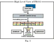 In cryptography, FROG is a block cipher authored by Georgoudis, Leroux and Chaves. The algorithm can work with any block size between 8 and 128 bytes, and supports key sizes between 5 and 125 bytes. The algorithm consists of 8 rounds and has a very complicated key schedule.