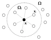 Similar to other meshfree methods for PDEs, the finite point method (FPM) has its origins in techniques developed for scattered data fitting and interpolation, basically in the line of weighted least-squares methods (WLSQ). The latter can be regarded as particular forms of the moving least-squares method (MLS) proposed by Lancaster and Salkauskas.[4] WLSQ methods have been widely used in meshfree techniques because allow retaining most of the MLS, but are more efficient and simple to implement. With these goals in mind, an outstanding investigation which led to the development of the FPM began in (Oñate, Idelsohn & Zienkiewicz, 1995a)[5] and (Taylor, Zienkiewicz, Oñate & Idelsohn, 1995).[6] The technique proposed was characterized by WLSQ approximations on local clouds of points and an equations discretization procedure based on point collocation (in the line of Batina’s works, 1989,[7] 1992[8]). The first applications of the FPM focused on adaptive compressible flow problems (Fischer, Onate & Idelsohn, 1995;[9] Oñate, Idelsohn & Zienkiewicz, 1995a;[5] Oñate, Idelsohn, Zienkiewicz & Fisher, 1995b[10]). The effects on the approximation of the local clouds and weighting functions were also analyzed using linear and quadratic polynomial bases (Fischer, 1996).[11] Additional studies in the context of convection-diffusion and incompressible flow problems gave the FPM a more solid base; cf. (Oñate, Idelsohn, Zienkiewicz & Taylor, 1996a)[1] and (Oñate, Idelsohn, Zienkiewicz, Taylor & Sacco, 1996b).[2] These works and (Oñate & Idelsohn, 1998)[3] defined the basic FPM technique in use today.