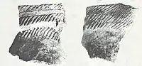 Two Late Woodland pottery ware groups were present at the Fort Wayne mound. The first, Wayne ware, is an early Late Woodland ware thought to have evolved out of the Middle Woodland period. Wayne ware is usually cordmarked and quite plain and utilitarian without much decoration. The other group is Riviere ware, first identified at the Riviere Au Vase site and associated with the Western Basin (aka Younge) tradition. This ware group is more elaborate and is often collared and/or castellated. Both ware groups were specially segregated at the site and both were observed to have food residues resulting from use as a cooking pot.[1][5]