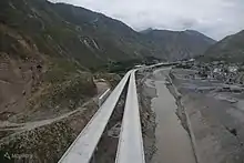 Starting from the south of Lanzhou, the expressway enters the New Qidaoliang tunnel (length 4,070 metres (2.53 mi)) through the Xinglongshan mountains, from where it follows the Tao River parallel to G212. Past Lintao, the route diverges from the Tao river valley and passes through hilly landscape through a couple of tunnels until exiting in the Wei River valley. From there it continues through the 15.2 kilometres (9.4 miles) long Muzhailing Tunnel.[5] In Min County, the expressway parallels G212 again until Longnan, exiting Gansu through a mountainous valley by numerous tunnels and viaducts.
