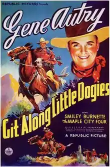 Git Along Little Dogies is a 1937 American Western film directed by Joseph Kane and starring Gene Autry, Smiley Burnette, and the Maple City Four. Written by Dorrell and Stuart E. McGowan, the film is about a singing cowboy who gets caught up in a war between oilmen and cattle ranchers, taking the side of the ranchers until he learns that oil will bring a railroad to town.[1] The film is also known as Serenade of the West in the United Kingdom.[2]