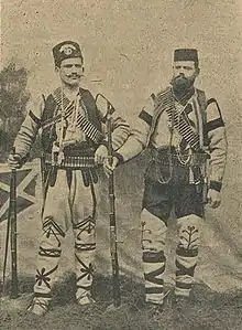 On 25 April, two bands (četa) of some 20 fighters under voivodes Anđelko Aleksić and Đorđe Cvetković swore oath in a ceremony of the Serbian Chetnik Committee (Dr. Milorad Gođevac, Vasa Jovanović, Žika Rafailović, Luka Ćelović and General Jovan Atanacković), with prota Nikola Stefanović holding the prayers.[14] The Committee had prepared the formation of the first bands for a number of months.[14] The Chetniks were sent for Poreče, and on 8 May they headed out from Vranje, to Buštranje, which was divided between Serbia and Turkey.[17] Vasilije Trbić, who guided them, told them that the best way was to go through the Kozjak and then down to the Vardar.[18] The two voivodes however, wanted the fastest route, through the Kumanovo plains and then to Četirac.[18] They managed to enter Turkish territory but were subsequently exposed in the plain Albanian and Turkish villages, and the Ottomans closed in on them from all sides, and they decided to stay on the Šuplji Kamen, which gave them little defence instead of meeting the army on the plains; in broad daylight, the Ottoman military easily poured bombs over the hill and killed all 24 of the Chetniks.[19]