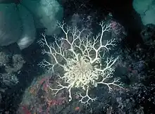 It feeds by perching in an elevated position and extending its arms in a net-like fashion perpendicular to the current. The branches and branchlets twist and coil, making it resemble an animated bush.[6] It ensnares small crustaceans such as the northern krill (Meganyctiphanes norvegica), copepods, chaetognaths, jellyfish, and detritus that come within reach. Trapped prey becomes the centre of a "knot" where it is immobilised by the secretion of mucus. Further coiling of the branches brings the food to the mouth which is on the underside of the central disc. Here, the branchlets are passed through a comb-like structure which removes the food particles. There is no anus and any undigested fragments are expelled through the mouth.[2][4][6]