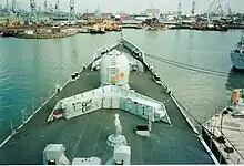 This location proved to be an unsuitably wet one for the Phalanx system despite the modifications to this warship, and Edinburgh was later fitted with a pair of wing-mounted CIWS as carried by the other ships of the class, but she retained her distinctive bulwark and enlarged breakwaters.