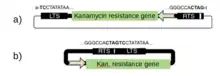 a) Plasmid containing the helitron: the antibiotic resistance gene (kanamycin) is inserted between the left and right terminal sequences (LTS and RTS respectively) ; b) Circular intermediate of transposition: the terminal sequences are joined together (grey arrow indicates promoter of the gene)