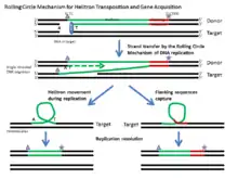 Helitrons are one of the three groups of eukaryotic class 2 transposable elements (TEs) so far described. They are the eukaryotic rolling-circle transposable elements which are hypothesized to transpose by a rolling circle replication mechanism via a single-stranded DNA intermediate.[1] They were first discovered in plants (Arabidopsis thaliana and Oryza sativa) and in the nematode Caenorhabditis elegans, and now they have been identified in a diverse range of species, from protists to mammals. Helitrons make up a substantial fraction of many genomes where non-autonomous elements frequently outnumber the putative autonomous partner. Helitrons seem to have a major role in the evolution of host genomes. They frequently capture diverse host genes, some of which can evolve into novel host genes or become essential for Helitron transposition.[2]