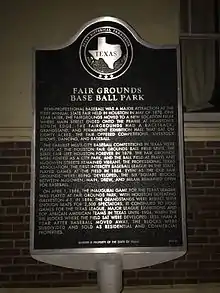 On July 2, 1884, a meeting was held in the office J. W. Mitchell that decided to issue 120 shares of stock at $10 each for the purpose of preparing a baseball park.[6] Mitchell, along with W. H. Coyle and Colonel Will Childress headed a committee to sell such shares. Built in a largely unpopulated area of prairie land, on the grounds of the State Fair of Texas, fences and a grandstand were erected on the site by 1885.[3]
