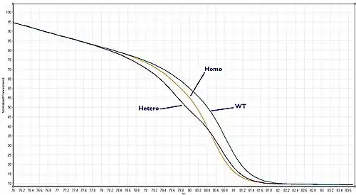 These three scenarios are known as "Wild–type", "Heterozygote" or "Homozygote" respectively. Each gives a melt curve that is slightly different. With a high quality HRM assay it is possible to distinguish between all three of these scenarios.