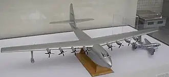 The HK-1 aircraft contract was issued in 1942 as a development contract[10] and called for three aircraft to be constructed in two years for the war effort.[11] Seven configurations were considered, including twin-hull and single-hull designs with combinations of four, six, and eight wing-mounted engines.[12] The final design chosen was a behemoth, eclipsing any large transport then built.[10][13][N 1] It would be built mostly of wood to conserve metal (its elevators and rudder were fabric-covered),[14] and was nicknamed the Spruce Goose (a name Hughes disliked) or the Flying Lumberyard.[15]